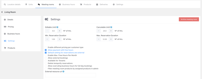 Go to the Settings for the selected meeting room and then proceed to Archive Meeting Room to archive it.